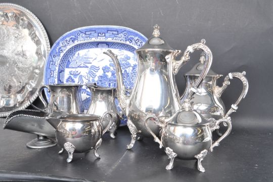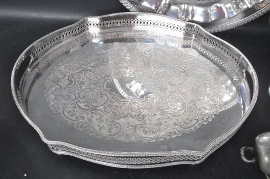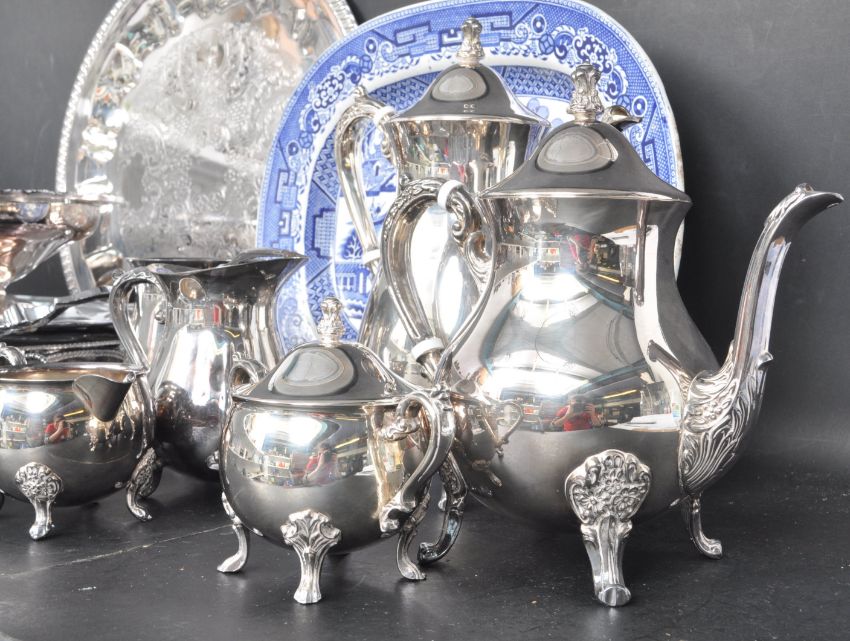 A large collection of vintage 20th century silver plated ware to include teapot, hot water pot, creamer jug, sugar bowl, serving trays and many more. All being decorated with foliate motifs. Measures 32cm x 28cm.