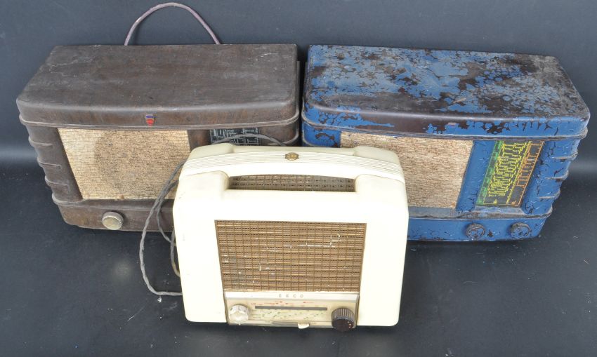 A collection of three vintage 20th century radios comprising of a Ekco radio having cream casing with carry handle to the top, A Philips / Marconi valve radio together with another.