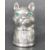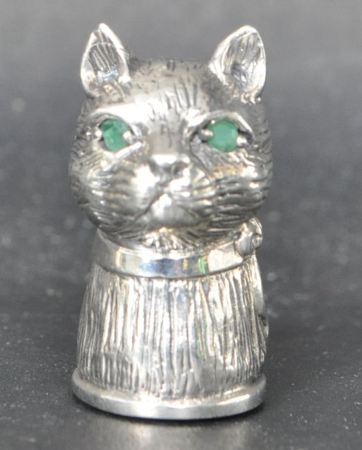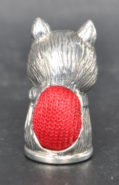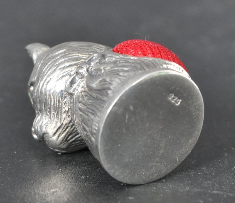 A silver pin cushion in the form of a cat having green stone set eyes and a red pin cushion to the back. Marked 925. Weight 11.3g. Measures 2.5cm.
