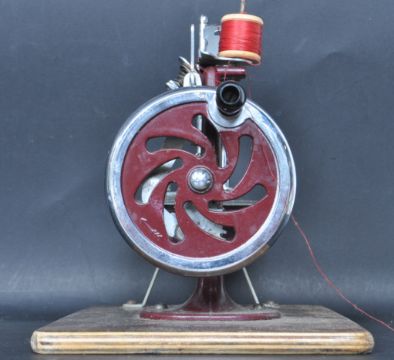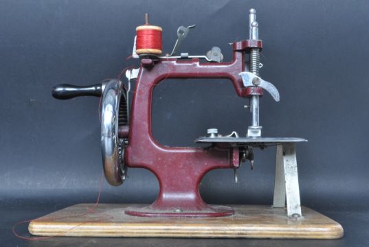 A mid 20th century Singer style children's sewing machine with hand crank to the rear having a burgundy red metal frame raised on a wooden base. Measures 20cm high.