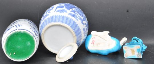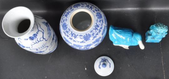 A collection of vintage 20th century Chinese / Oriental porcelain china comprising of a blue and white waisted neck vase, an ovoid lidded vase, a foo / temple dog together with a blue ceramic duck figure. Measures 37cm tall.