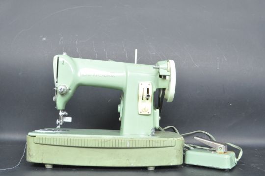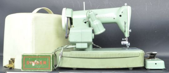 Singer Sewing Machine - Model 185K - A vintage mid 20th Century table / desk top cased sewing machine having a small adjustable light with all finished in sage green. Comes with spears and foot pedal. Measures approx;