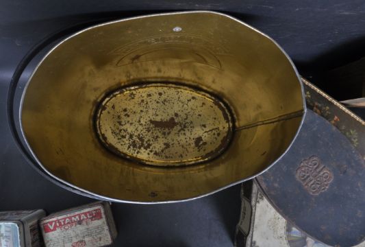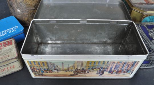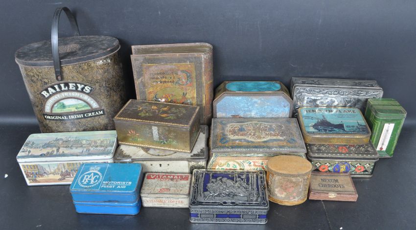 A collection of vintage 20th century biscuit tins comprising of Vitameal Toffee tin, Baileys Cream bucket, a tin having Medieval scenes and many more.