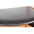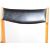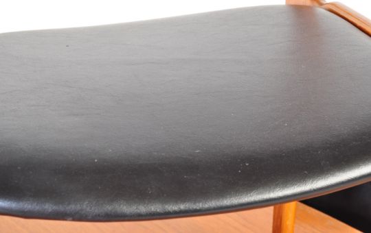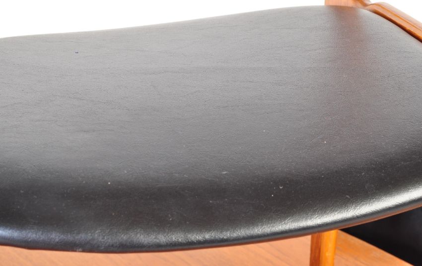 A mid century teak wood Danish dining table and chairs suite. The table of rectangular form with rounded corners being raised on shaped legs. Above, an extending top with central fold over leaf. Together with a set of dining chairs having matching legs with black faux leather seats and back rests. Stamped Made in Denmark to underside. 73cm x 187cm x 106cm.