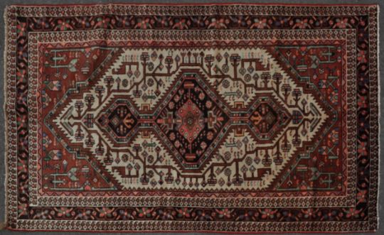 A mid 20th century wool on cotton hand knotted northwest Persian / Iran Hamadan rug / carpet. The rug having a large cream colour medallion with three small brown inner medallions set on a brown field decorated with native / geometrical motifs flanked by a dark colour main border decorated with foliage motifs. Originally from Bijar province. Measures: 247cm x 146cm.