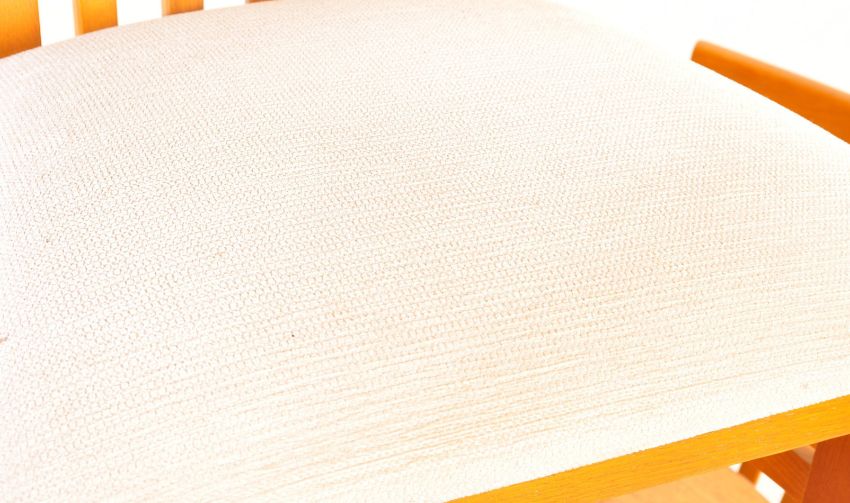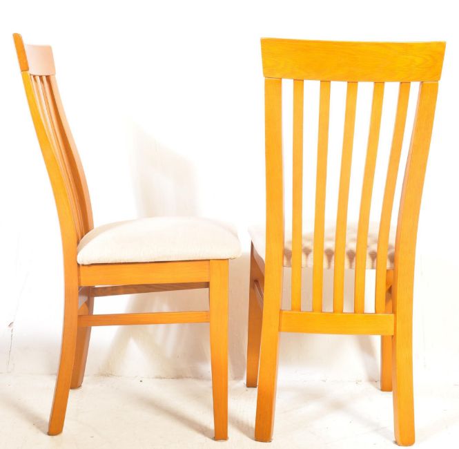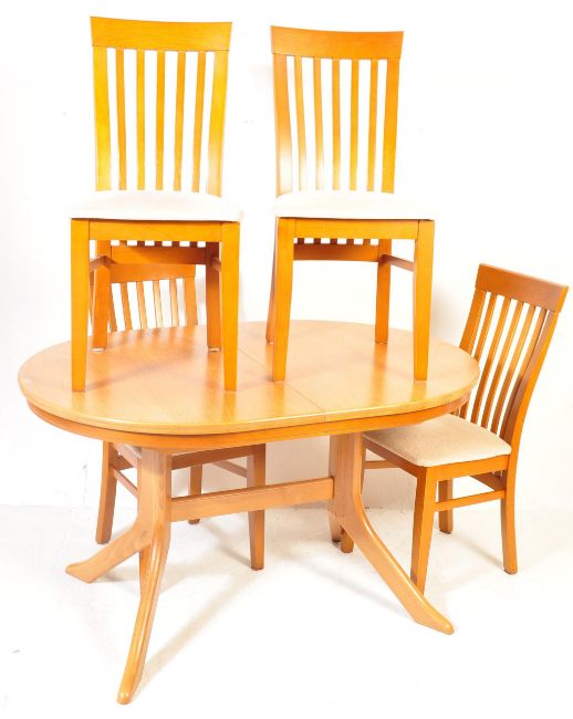 A late 20th century Danish inspired teak wood dining suite. The suite comprising of a extending table with oval top raised on splayed base together with four chairs having spindle back rest, padded seats raised on square legs. Measures 75 x 168 x 93cm.