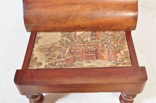 A 19th century Victorian mahogany step commode. The step commode of a rectangular form having shaped / waterfall front with hinged lid raised on turned legs. Measures 40 x 42 x 44cm.