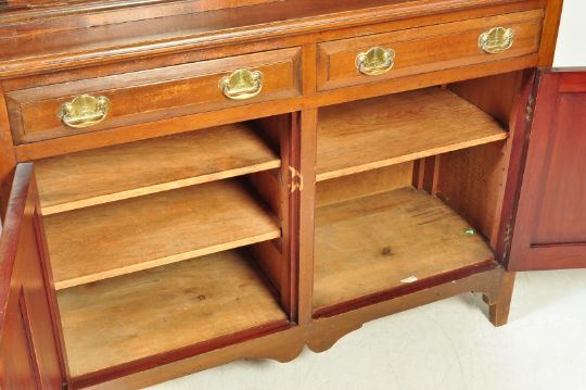 An early 20th century Arts and Crafts mahogany bookcase having a flared cornice with sliding lead glazed doors opening to reveal shelves interior. The base has two drawers with brass art nouveau handles over twin fielded panel doors raised on bracket feet. Measures approx. 204cm x 133cm x 52cm.