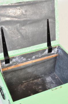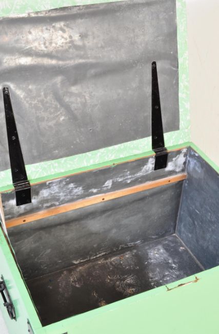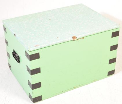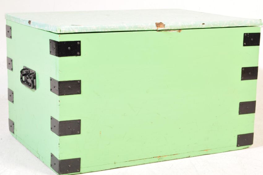 A Victorian 19th century painted pine work box / blanket box of rectangular form with cast metal bracket work to the sides. Hinged top above. Measures 132cm x 122cm x 49cm.