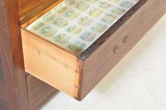 An early 20th century circa 1910s Art Deco mahogany dressing table chest having a single mirror over an inlaid gallery back atop two drawers. The chest has a bank of two over two drawers raised on a plinth base.