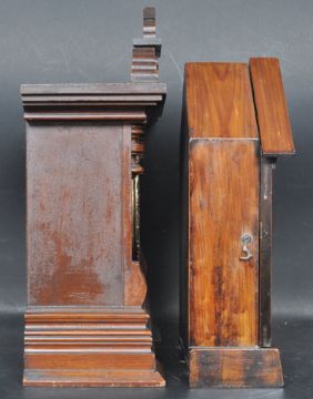 A Victorian 19th century 8 day mantel clock having a carved pediment top over a brass and enamel clock face raised on a stepped base. Together with a 19th century Victorian spire clock. Largest measures 40cm tall.