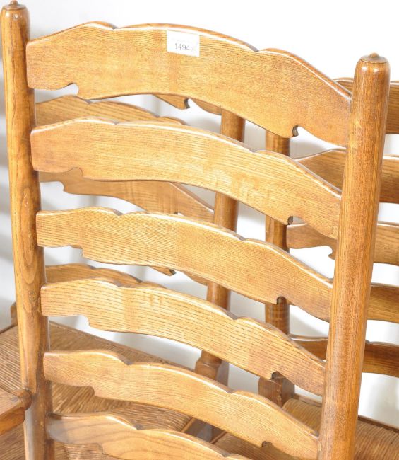 A set of eight vintage mid 20th century oak ladderback dining chairs having rush envelope seats raised on upright supports united by peripheral stretchers. Measures 110 x 57 x 42cm.