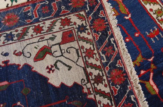 A vintage 20th century Persian Islamic rug having a central medallion of red, blue and white with a cobalt blue field, spandrels to each corner and tassels to each end. Measures approx. 185cm x 137cm