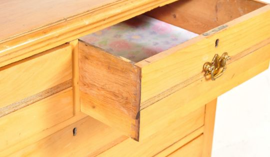 An Edwardian satin walnut chest of drawers. The chest being raised on squared legs with 2 short drawers over 3 deep drawers beneath. All with reeded detailing and brass swing handles and back plates. Flared caddy top above. Measures 104 x 104 x 52cm.
