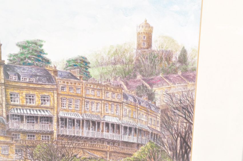 Adrian Sykes (1970-) Buildings of Bristol – A hand coloured print in pencil and watercolour of building in Clifton, Bristol. Framed and glazed being signed in pencil to the margins. Measures 56cm x 68cm
