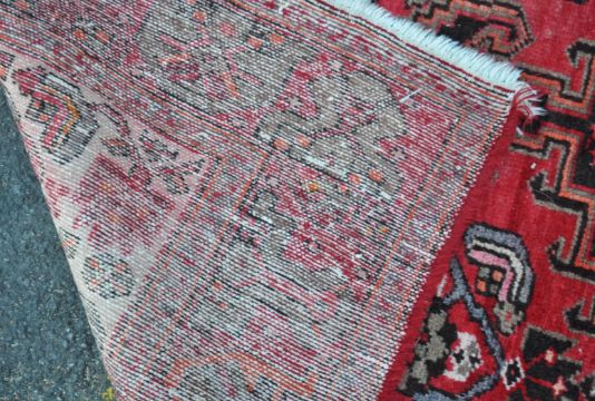 A 20th century hand knotted wool on wool Persian Islamic Hamadan rug / carpet having bright red field decorated with nomadic geometrical motifs and cream colour corners.