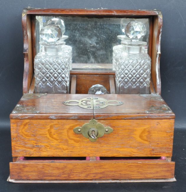 An early 20th century mirror backed oak tantalus having pierced brass embellishments to the corners and armorial crest to the centre. Comes with two glass decanters. Complete with key. Measures 36cm high x 37cm tall.