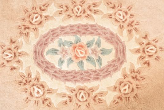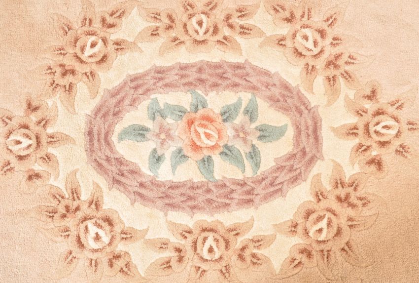 A vintage 20th century Chinese Oriental rug of oval form having a white background with polychrome floral decoration.
