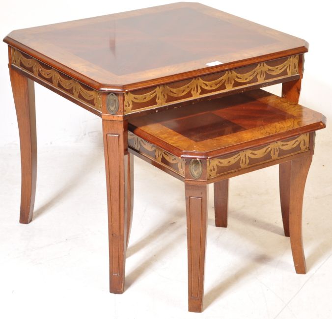 A vintage 20th century mahogany quarter veneer nest of graduating tables having blind fretwork to the frieze raised on tapering legs. Measures approx. 57cm x 66cm x 58cm.