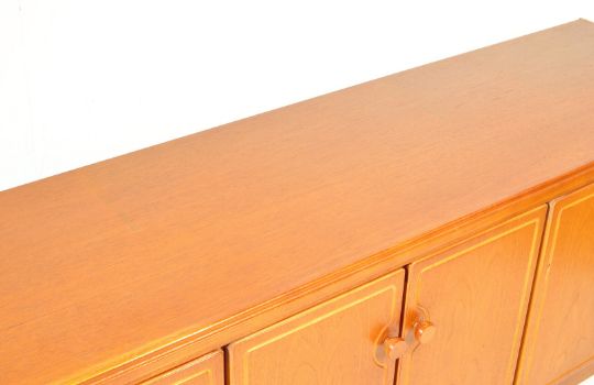 A vintage retro late 20th century teak wood sideboard credenza / low sideboard. The sideboard of a low long proportion having three cupboard with decorated panel doors raised on a plinth base. Measures 64cm x 202cm x 50cm.