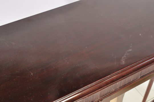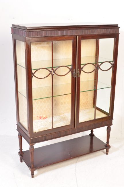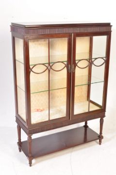 An  Edwardian mahogany china display cabinet vitrine. The cabinet being raised on turned and tapering legs united by a low tier. Above,  a twin door display cabinet having lined interior with glass shelves. Astragal glazed doors to the front. Measures approx. 137cm x 94cm x 37cm.