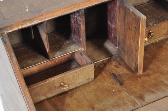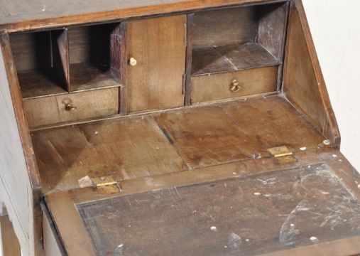 An 18th century Queen Anne mahogany bureau desk. The bureau having a fall front with fully appointed interior over single drawer to the frieze raised on square legs.