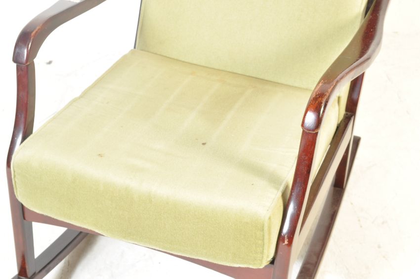 A mid century retro rocking chair / armchair. Raised on mahogany frame with sleight runners having green velour upholstered seat with shaped elbow rests either side. Measures 93cm H x 64cm W x 54cm D