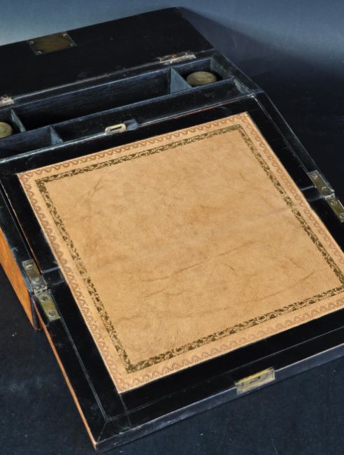 A 19th century Victorian walnut Tunbridge writing slope / box. The writing slope / box of a rectangular form with hinged lid, mother of pearl plaque to the top and mother of pearl lock plaque flanked by rosewood and mahogany inlaid bands and fitted interior.
