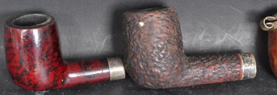 A vintage 20th century K & P sterling silver collared Donegal Rocky hardwood smoking pipe. Stamped to the collar. Together with three white metal collared hardwood smoking pipes. Measures 8.5cm