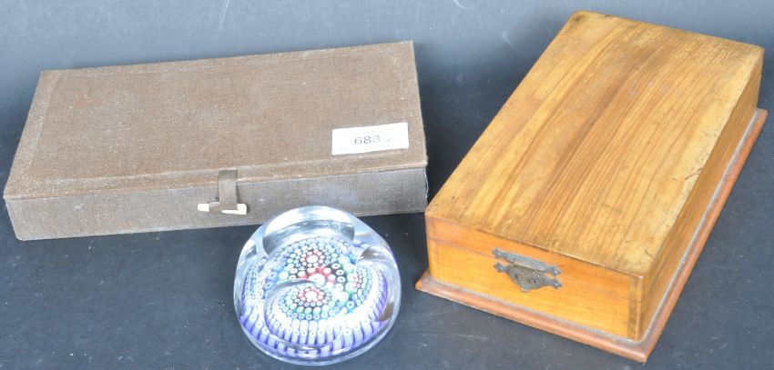 A satinwood cased Chinese artists / calligraphers writing set. The decorative case with hinged top opening to reveal a series of wooden handled instruments set within. Together with a wooden Chinese cased block seal in presentation case with gilt lacquer character marks. Also, a milliefiori canework paperweight. Measures 5cm x 21cm x 11cm.