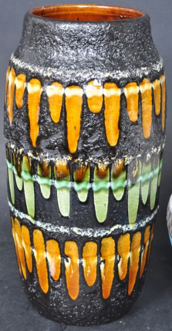 A group of three mid 20th century circa 1960s West German vases to include a fat lava drip glaze vase. All marked to the base. Measures 23cm tall.