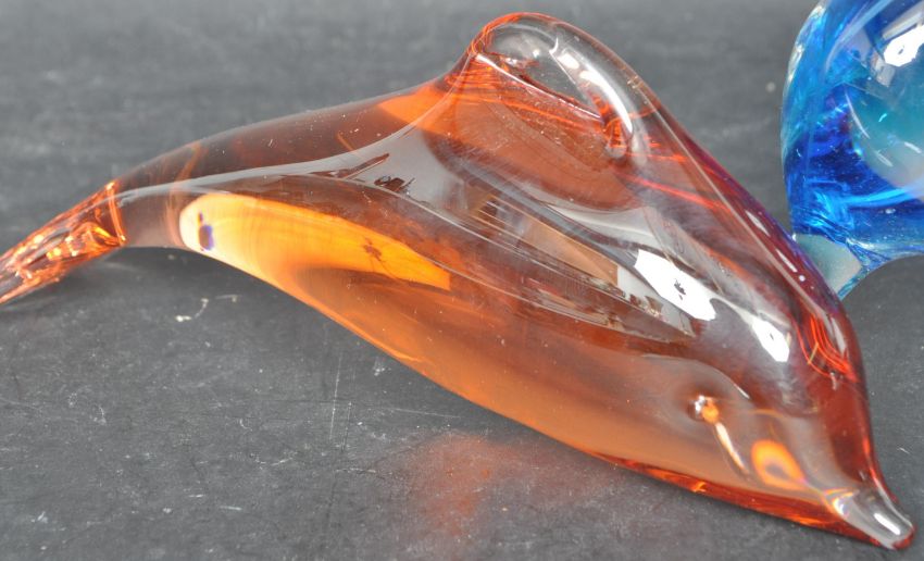 A pair of late 20th century glass dolphin ornaments to include an orange glass Wedgwood dolphin and a large Murano glass blue dolphin. Largest measures 40cm in length.