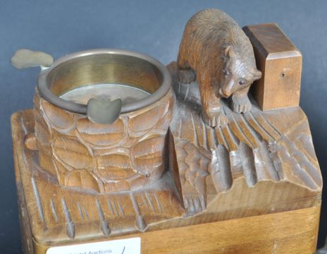 A collection of 19th century German Swiss Alpine Black Forest carved wooden bear related curios comprising of an ashtray having a bear to one side and secret drawer below, carved wooden ashtray, carved wooden solifleur vase and more. Measures 15cm tall.