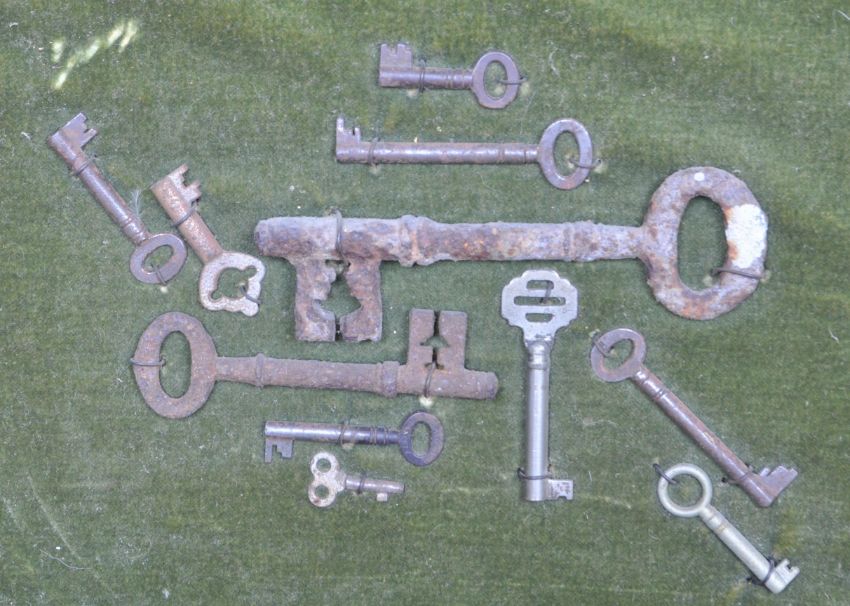 A collection of mounted vintage cast iron and metal keys. To include large 19th century examples and later 20th century furniture keys. All set to a green velour backing and in gilt frames. Measures 43cm x 52cm.