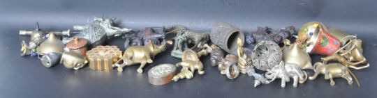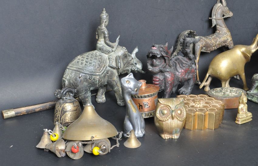 A large collection of 20th century and earlier brass cabinet ware. The collection comprising of a ceremonial Dogon brass horse / Hucul pony horse, elephants, hippopotamus, Buddha, and many more spiritual figurines.