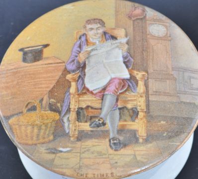 A collection of 19th century Pratt Ware Fenton pots to include: The Times, Prince of Wales Visiting the Tombs of Washington, The Village Wedding, Anne Hathaway's Residence and 2 other modern examples. Measures 11cm diameter.