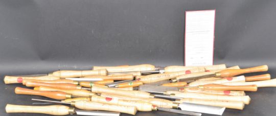 A large collection of vintage Robert Sorby, Sheffield woodworking tools. The collection comprising of various sizes and shapes chisel / accessories for woodturning lathes. Measures 54cm long.