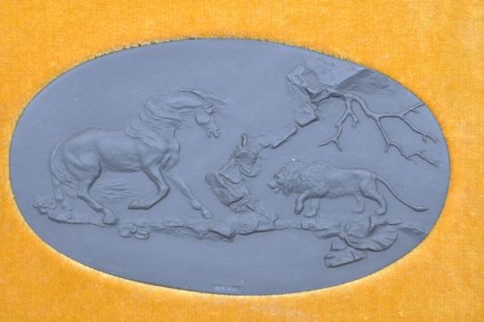 A 20th century 1984 limited edition Wedgwood black basalt jasperware anniversary plaque of the Frightened Horse by George Stubbs. No 10 in an edition of 250. Measures 22cm x 17cm. Set within a felt mount and gilt frame. Measures 17cm x 22cm.