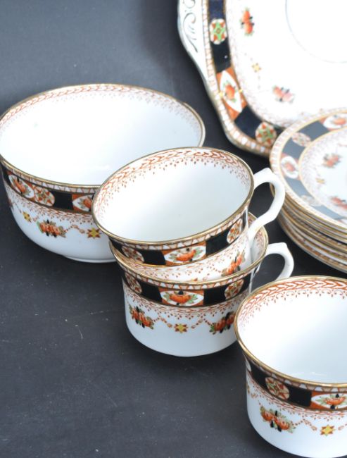 A vintage early 20th century Roslyn china tea service to include eleven teacups, twelve saucers, twelve side plates, two cake plates, a creamer milk jug and a sugar bowl. Each piece having hand painted floral decoration with gilt edges. Makers mark to the base.