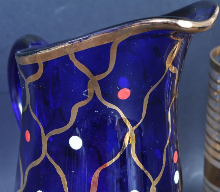A retro vintage 1960's lemonade pitcher jug with two matching hi-ball cocktail glasses along with a Bristol blue type and gilt glass pitcher jug. All having gilt or banded decoration. Largest measures approx; 27cm tall.