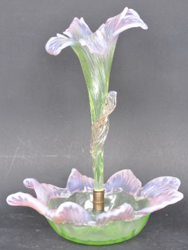 Early 20th century Art Nouveau vaseline glass epergne centrepiece. Pink and green glass dish with leaf edges having a tall flower  ' jack in the pulpit ' vase centre. Measures 29cm tall.