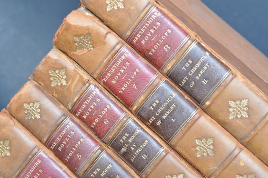 A set of eight Edwardian Anthony Trollope novels to include The Small House at Allington I & II, The Chronical of Barset, Barchester Towers, Doctor Thorne, The Last Chronical of Barset, The Warden and Framley Parsonage. Published 1906, George Bell & Sons, London.