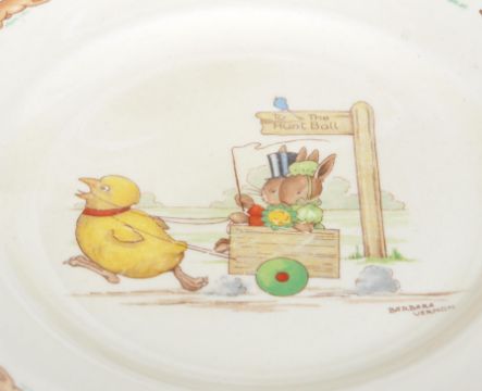 An assortment of vintage 20th century Royal Doulton Bunnykins china tableware. The collection to include cereal bowls, side plates, a twin handled cup and a money box. To include scenes such as See Saw, Game of Cricket, Art Class and more. Alongside a Golden Jubilee Bunnykins plate in original box and a Bunnykins 60th Anniversary plate in box. Measures 22cm in diameter.