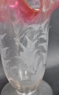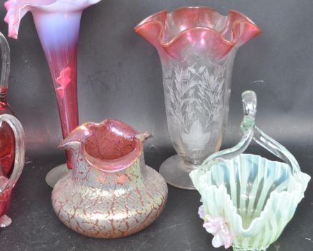 A collection of 19th century and later decorative glass including a Victorian cranberry glass vase, a Loetz style vase,  two Mary Gregory style jugs an Epergne and more. Largest measures  21cm high.