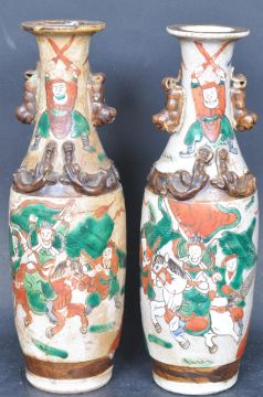 A pair of 19th century Chinese oriental ceramic porcelain vases. The vases of a baluster form with raised decorations and painted people scenes on a cracker glaze background raised on circular foot. Chinese characters to the underside. Measures 30cm tall.