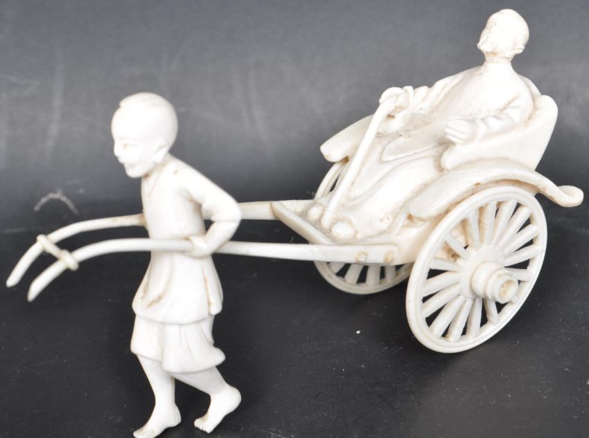 A collection of early 20th century Chinese Oriental ivory figurines comprising of a young boy, three monkeys, boy with a rickshaw, seated man together with six early 20th century canton napkin rings. Largest measures 8cm long.