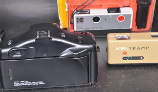 A collection of vintage 20th century camera equipment comprising of a Sanyo 8MM Camcorder VM-EX26P, Kodak Instamatic 100 Panasonic C-500AF, Nikai 35mm PDS camera, Hanimex 35mm, Euromax EU-3M, Brownie Vectra.