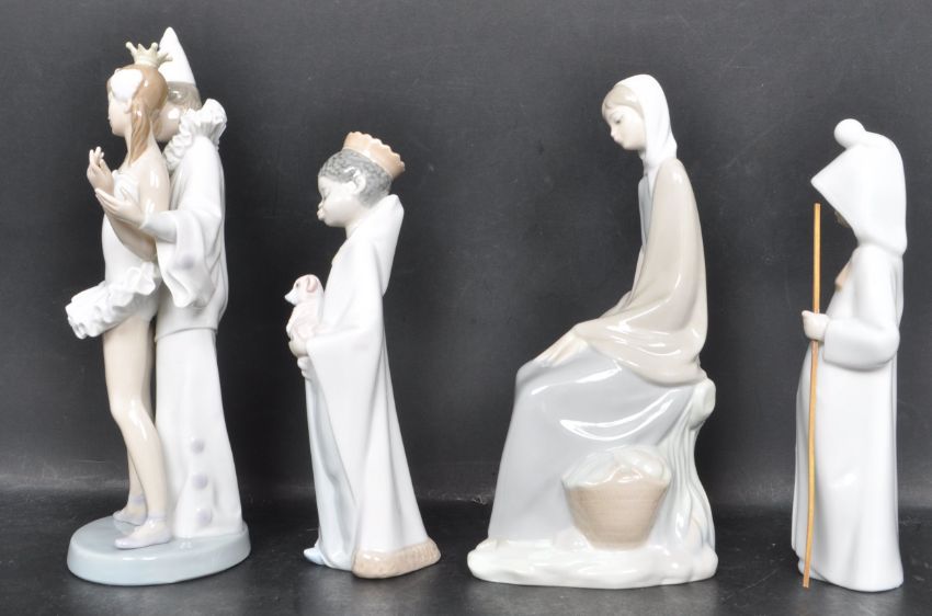 A group of four late 20th Century Spanish Valencian ceramic figurines to include a Lladro ballerina and clown figurine group, a Lladro boy holding a dog figurine, a Lladro girl holding a basket figurine and a Nao figurine of a seated woman with a basket. Tallest measures 26cm tall.