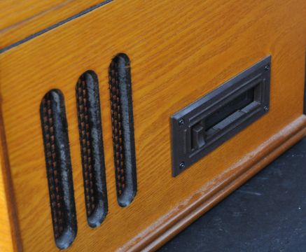 A vintage style combined vinyl record player, CD player, cassette player and radio. The item having CD player and radio controls to the front, cassette player to the side and turntable within. All within an oak veneer case. Measures 26cm x 43cm x 31cm.