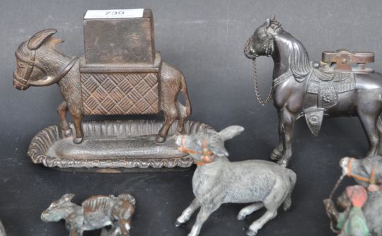 A collection of vintage 20th century metal animal figurines comprising of a donkey match striker, donkey table lighter, horse table lighter and more. Measures 12cm tall.